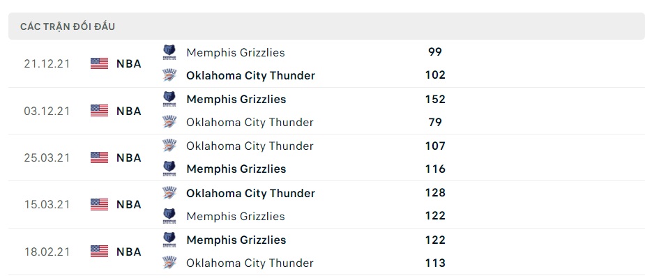 Lịch sử đối đầu Oklahoma City Thunder vs Memphis Grizzlies
