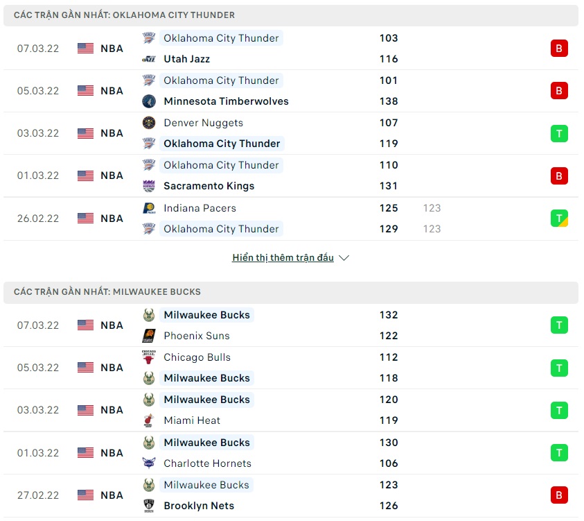 Phong độ gần đây Oklahoma City Thunder vs Milwaukee Bucks