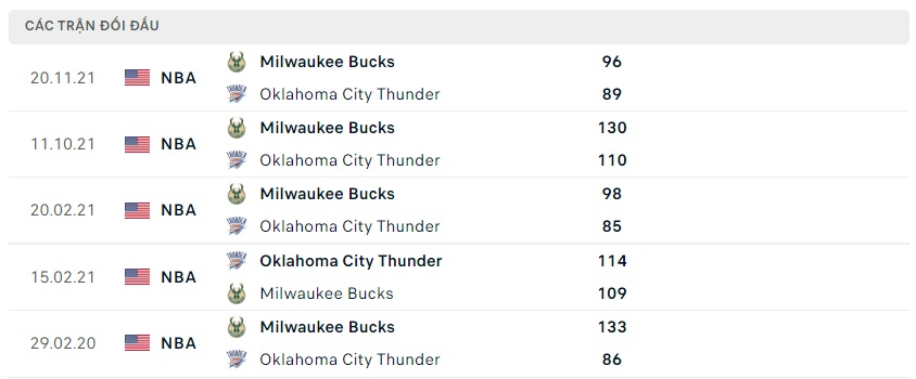 Lịch sử đối đầu Oklahoma City Thunder vs Milwaukee Bucks