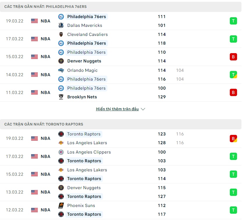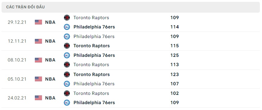 Phong độ gần đây Philadelphia 76ers vs Toronto Raptors
