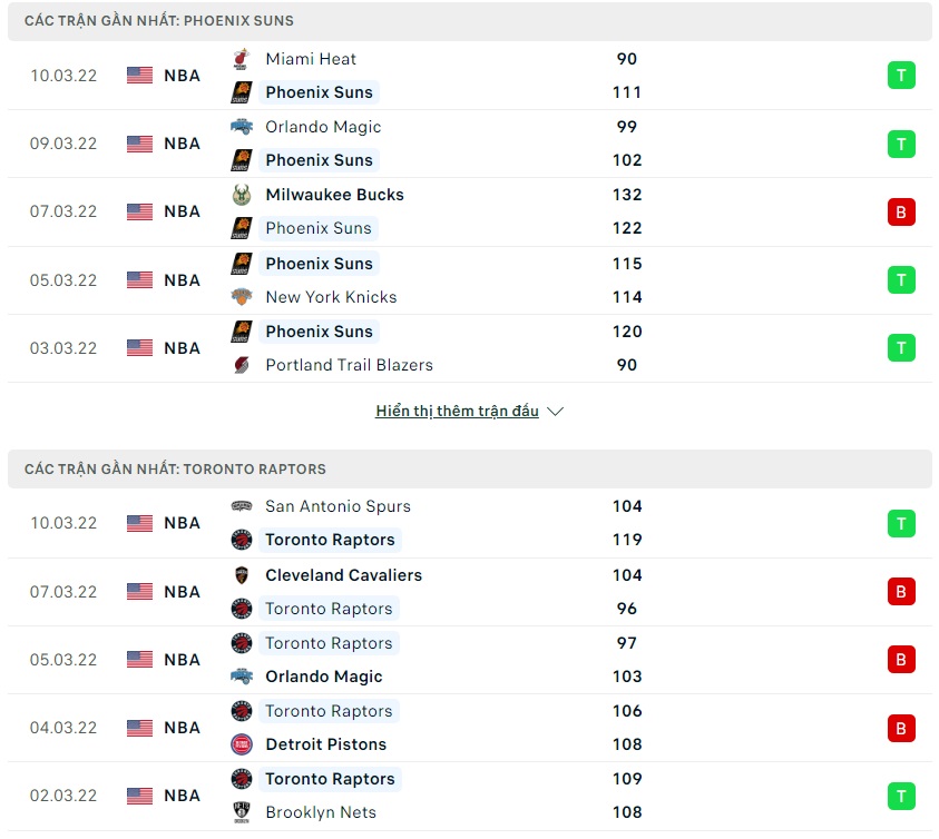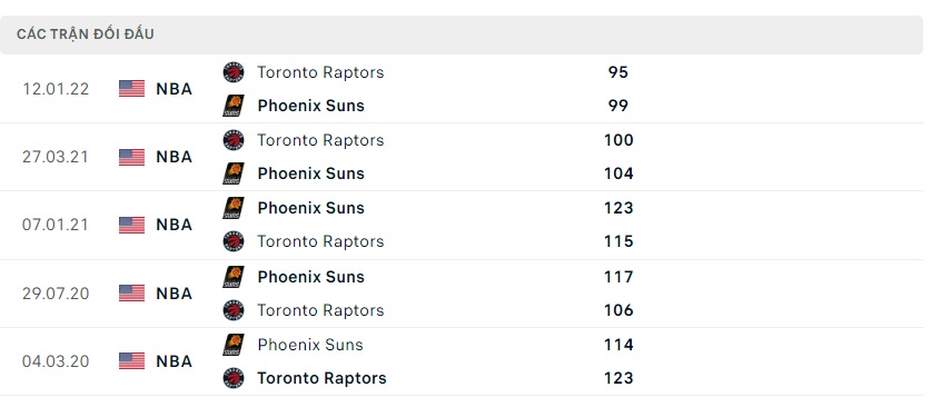 Phong độ gần đây Phoenix Suns vs Toronto Raptors