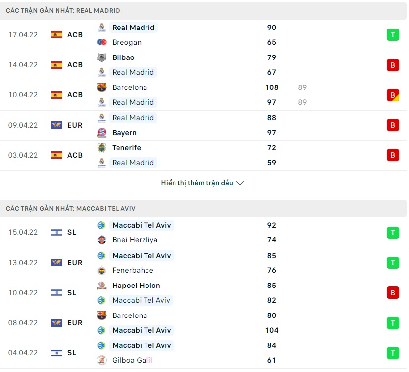 - Halftime: Real Madrid 44 - 45 Maccabi Tel Aviv ( Tài )