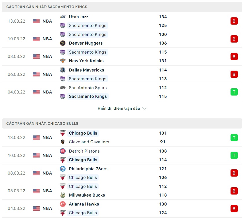 Phong độ gần đây Sacramento Kings vs Chicago Bulls