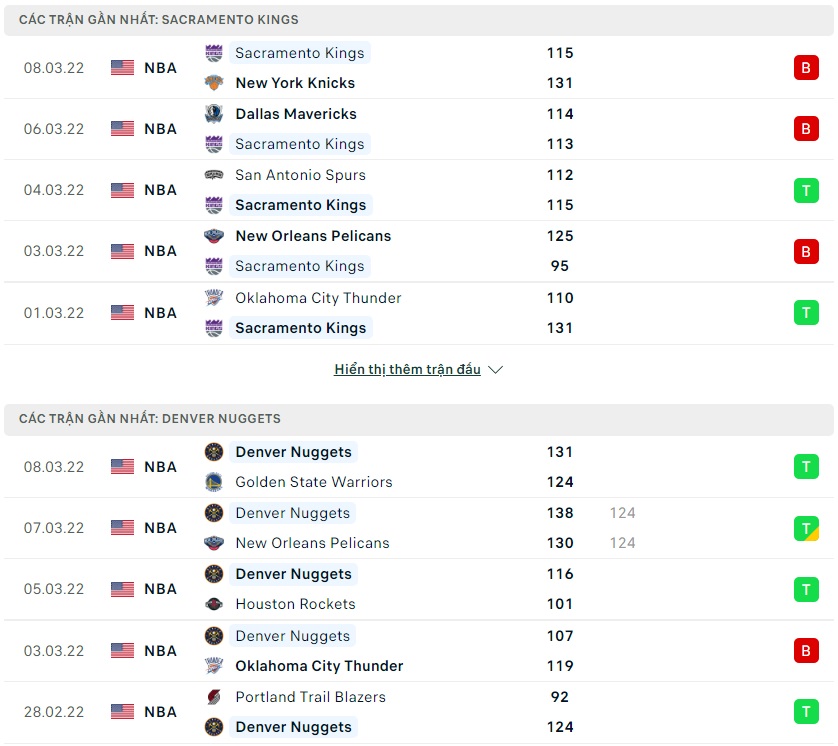 Phong độ gần đây Sacramento Kings vs Denver Nuggets