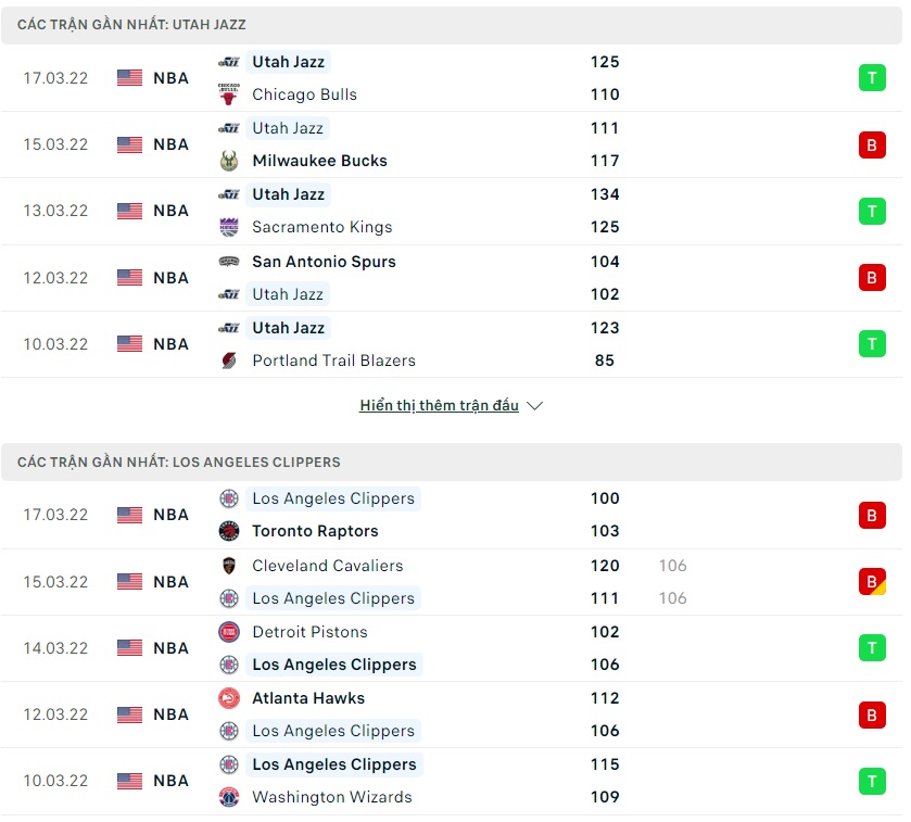 Phong độ gần đây Utah Jazz vs Los Angeles Clippers