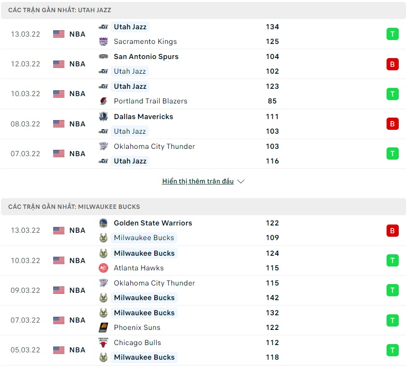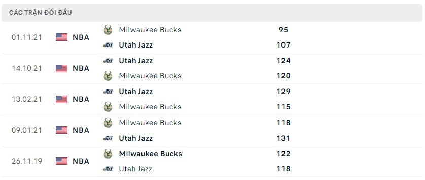 Phong độ gần đây Utah Jazz vs Milwaukee Bucks