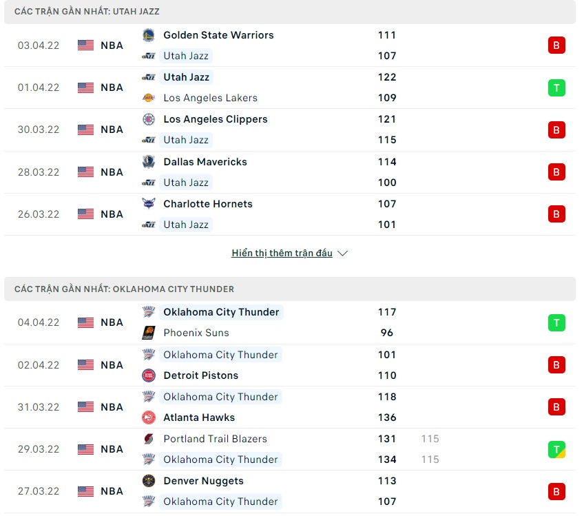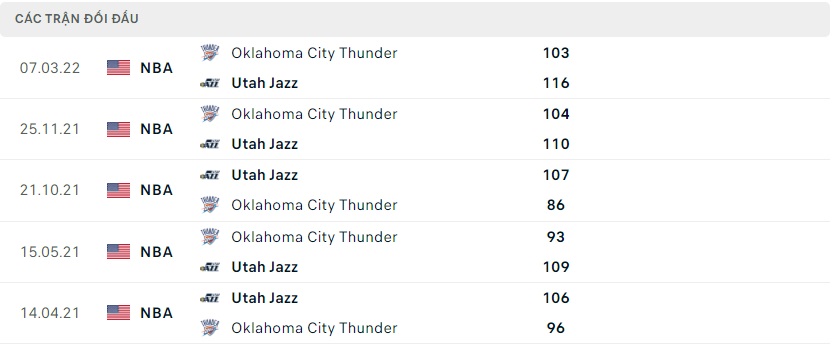 Phong độ gần đây Utah Jazz vs Oklahoma City Thunder