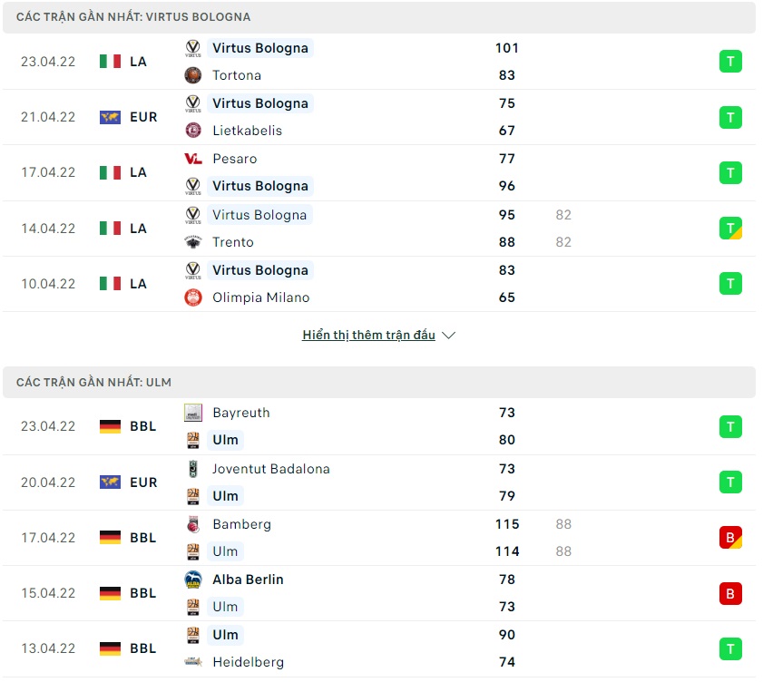 Phong độ gần đây Virtus Bologna vs Ratiopharm Ulm