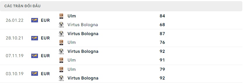 Trong quá khứ thì 2 đội đã có 4 lần chạm trán với nhau ở đấu trường Eurocup, 3 trong số đó chiến thắng thuộc về đại diện tới từ nước Ý. Thế nhưng trong lần chạm trán tại mùa thường niên năm nay, Virtus đã bất ngờ phải nhận thất bại với tỷ số 68-84 trước đại diện tới từ nước Đức. Đó là một trận đấu mà thầy trò Lakovic Jaka đã thua toàn diện sau khi chẳng thể gượng dậy với khoảng cách 11 điểm ở HT. Tất nhiên với phong độ điên rồ hiện tại sau 11 chiến thắng liên tiếp trên mọi đấu trường, Virtus sẽ tiến tới màn tái đấu với tâm thế cửa trên. Khí thế hiện có cộng hưởng với lợi thế sân nhà có thể đưa đội bóng nước Ý tiến tới chiến thắng thuyết phục ở trận đấu tới. Họ đang sở hữu một hàng công có đầu ra khá đồng đều ở đấu trường Châu Âu, với 6 cái tên có mức điều trung bình từ 10 trở lên. Jaiteh và Weems là 2 cái tên đã dẫn đầu danh sách ghi điểm của toàn đội trong chiến thắng trước Lietkabelis vừa qua với tổng điểm là 33. Về phía Ulm, 2 siêu sao là Christon và Blossomgame vẫn đang chiếm trọn Spotlight trước trận đấu này. Họ không quá mạnh ở khu vực vòng ngoài, nhưng khả năng đột phá từ những cá nhân đã tạo nên sự khác biệt trước Joventut ở trận đấu vừa rồi. Hàng thủ của Virtus cần phải thực sự tập trung để tránh mắc quá nhiều lỗi trước khi hiệp đấu quyết định chạm tới. Virtus vẫn có thể hướng tới một chiến thắng trong trận đấu này, tuy nhiên sẽ chẳng có một kịch bản đơn giản nào dành cho đội bóng nước Ý.