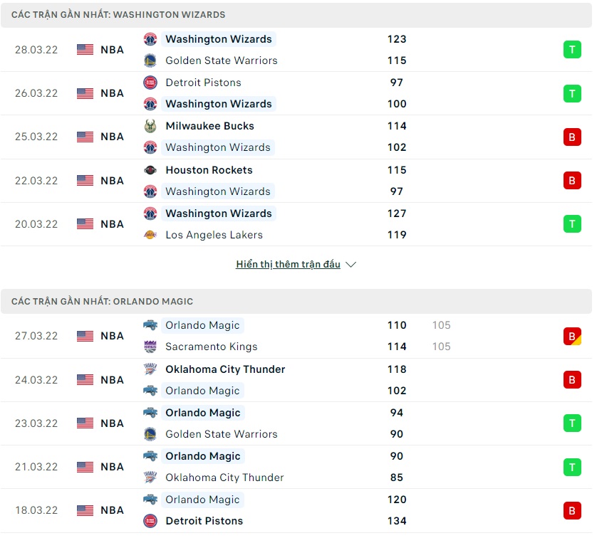 Phong độ gần đây Washington Wizards vs Orlando Magic