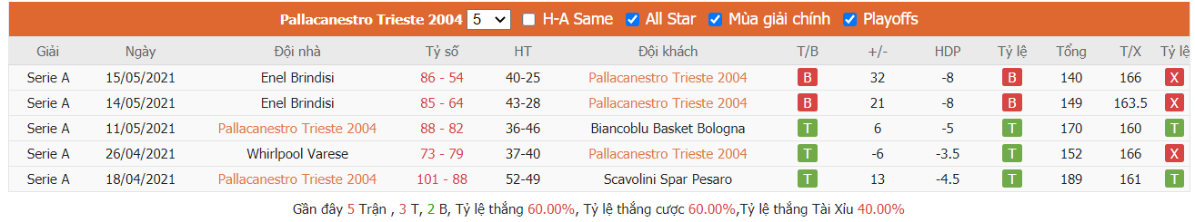 Phong độ gần đây Pallacanestro Trieste 2004 vs Bertram Tortona