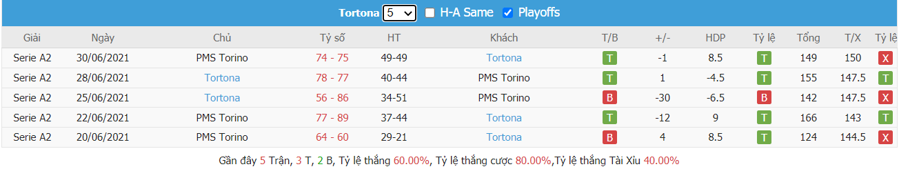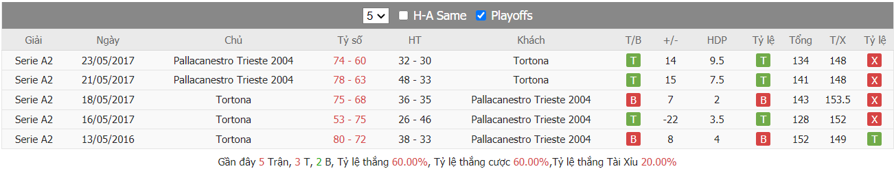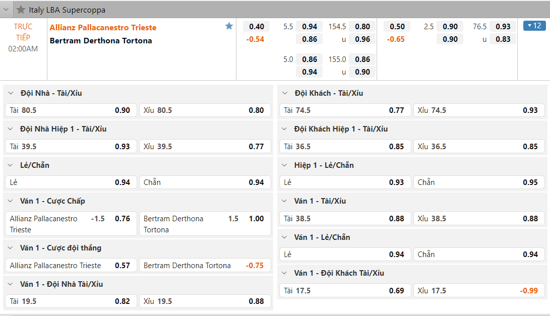 Bảng tỷ lệ kèo Pallacanestro Trieste 2004 vs Bertram Tortona