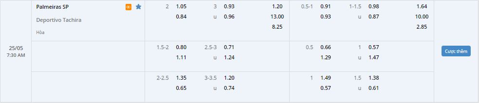 Bảng tỷ lệ kèo trực tuyến trận Palmeiras vs Deportivo Tachira