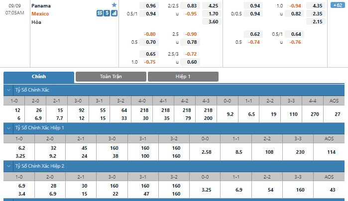 Bảng tỷ lệ kèo trực tuyến trận đấu Panama vs Mexico: