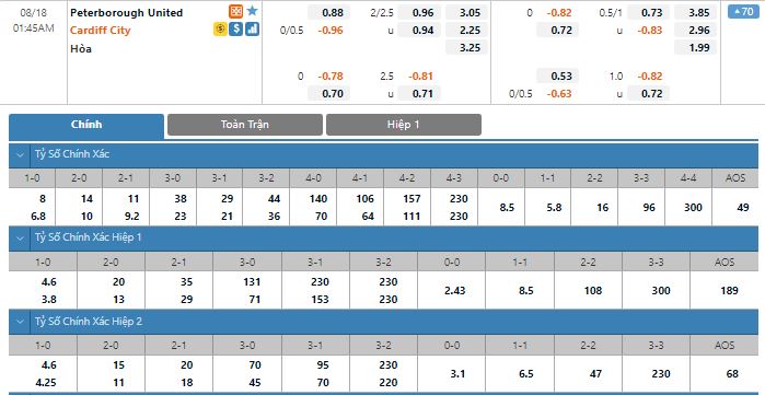 Bảng tỷ lệ kèo trực tuyến trận đấu Peterborough vs Cardiff: