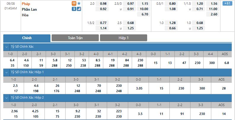 - Kèo tỉ số hiệp 1: Pháp 2-0 Phần Lan