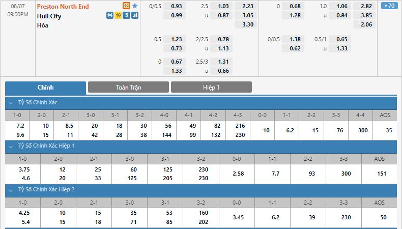 Bảng tỷ lệ kèo bóng đá Preston vs Hull City