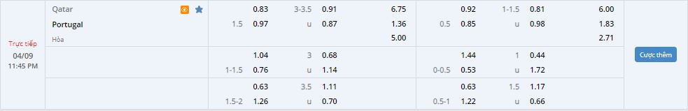 Bảng tỷ lệ kèo trực tuyến trận đấu Qatar vs Bồ Đào Nha