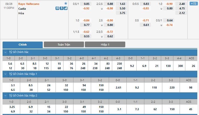 Bảng tỷ lệ kèo trực tuyến trận đấu Rayo Vallecano vs Cadiz: