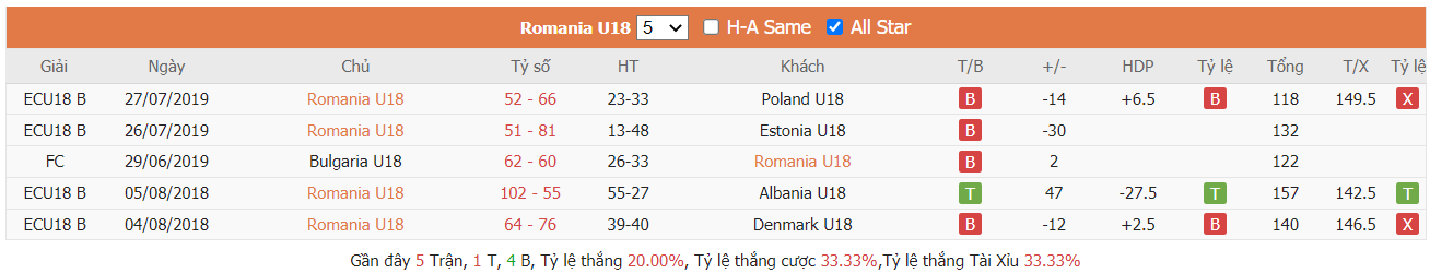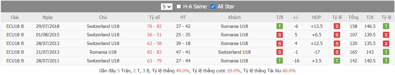 Thống kê cho thấy đây cứ trung bình mỗi trận sau tổng số 10 trận ra sân gần nhất Romania U18 cũng đều duy trì được sự phòng khoáng trong lối chơi khi mà trên hàng công đã ghi được trung bình tới 85 điểm mỗi trận và cũng đã để đối thủ bỏ vào rổ nhà trung bình tới 83 điểm mỗi. Từ đó dẫn tới 6 trên 10 trận đấu kể trên đều đã khép lại với các kết quả chung cuộc nổ tài. Vậy nên khả năng bùng nổ tỷ số ở trận tới cũng rất đáng được kỳ vọng khi mà cũng đã tới 7 trên 10 trận ra sân gần nhất của đội khách Switzerland U18 cũng đều đã vượt qua mức kèo niêm yết theo TLCA. Đồng thời Switzerland U18 cũng đã ghi được trung bình tới 87 điểm mỗi trận sau tổng số 10 trận ra sân gần nhất.