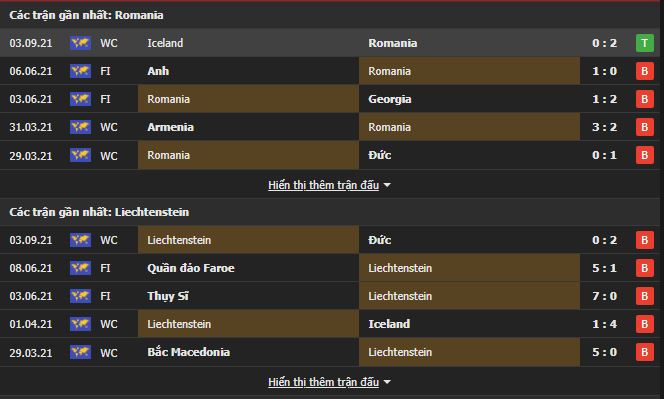 Phong độ gần đây Romania vs Liechtenstein: