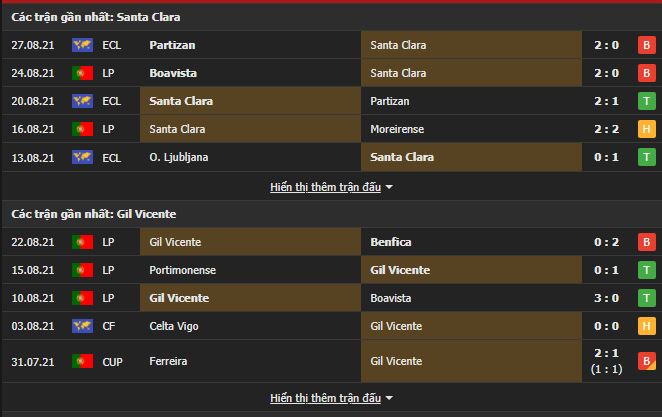Phong độ gần đây Santa Clara vs GIL Vicente: