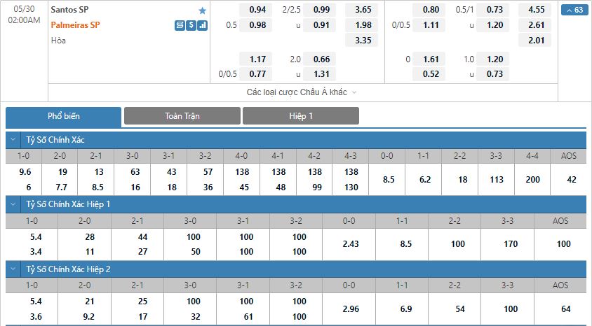 Bảng tỷ lệ kèo trực tuyến trận đấu Santos vs Palmeiras