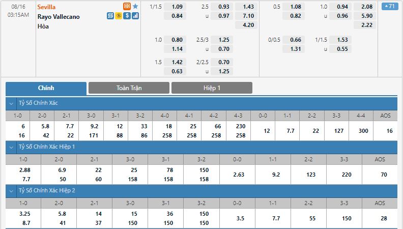 - Kèo tỉ số hiệp 1: Sevilla 1-0 Rayo Vallecano