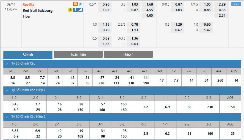 - Kèo tỉ số hiệp 1: Sevilla 1-0 Red Bull Salzburg