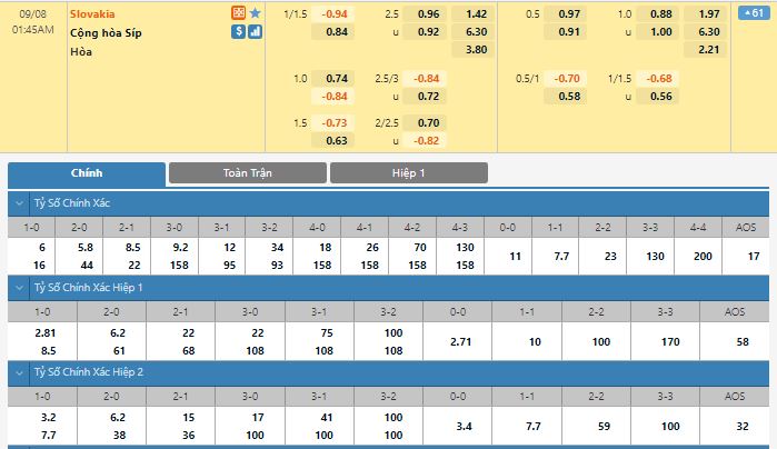 Bảng tỷ lệ kèo trực tuyến trận đấu Slovakia vs Đảo Síp: