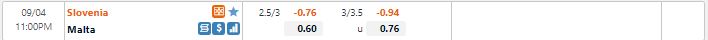 Bảng tỷ lệ kèo trực tuyến trận đấu Slovenia vs Malta: