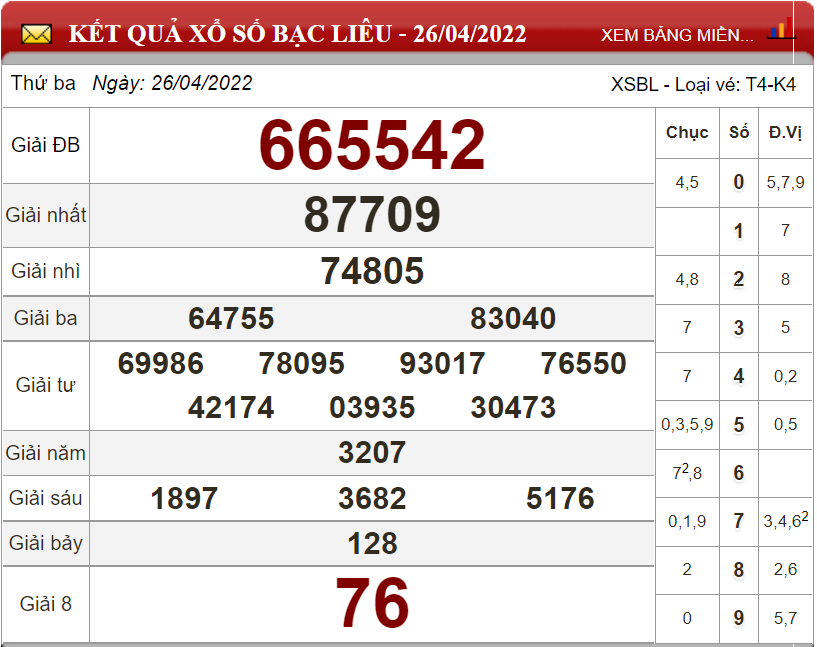 Kết quả lô đề theo xổ số Bạc Liêu ngày 26/4/2022