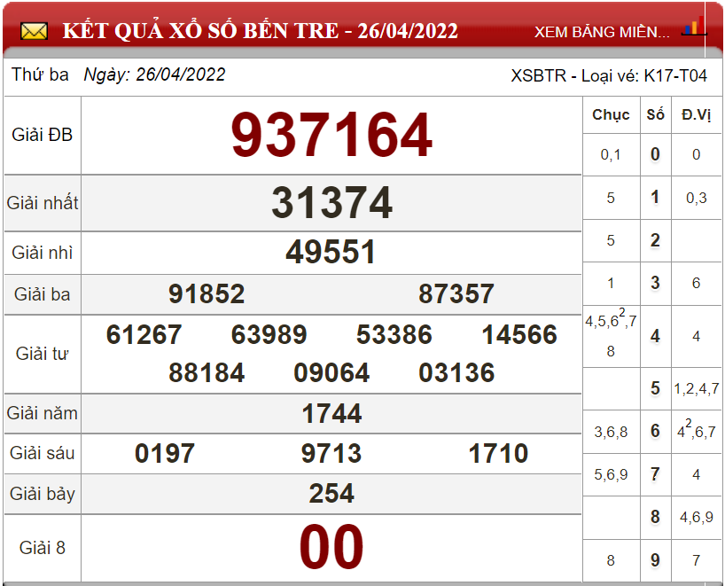 Kết quả lô đề theo xổ số Bến Tre ngày 26/4/2022