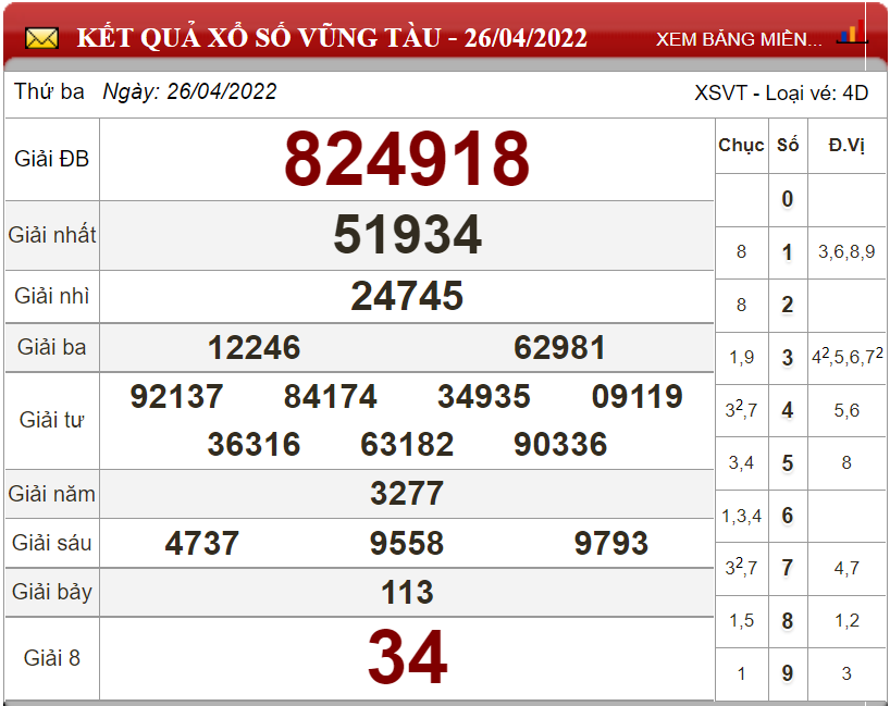 Kết quả lô đề theo xổ số Vũng Tàu ngày 26/4/2022