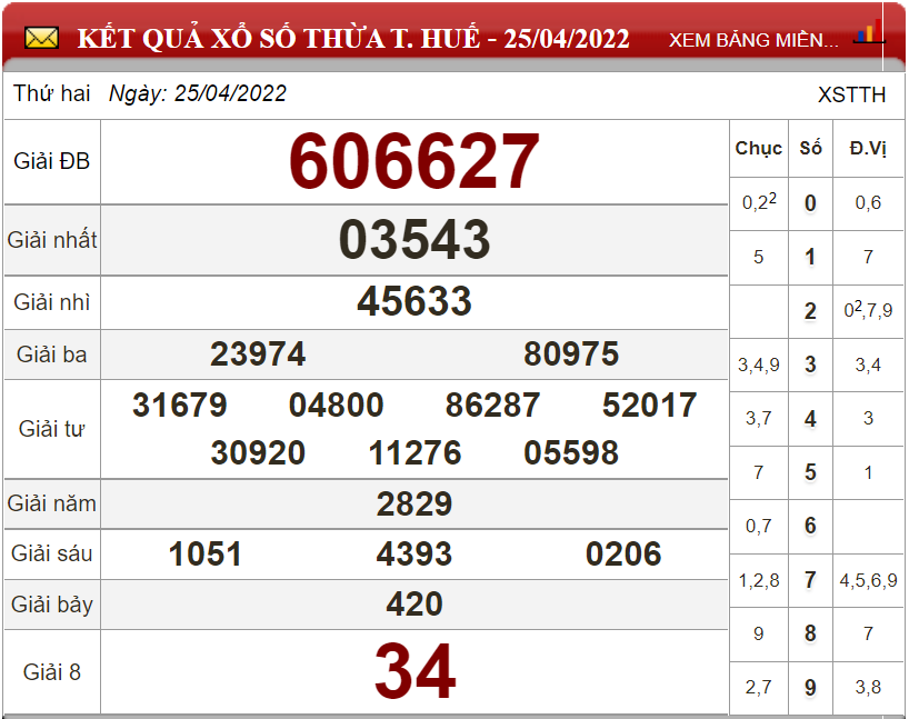 Kết quả lô đề theo xổ số Thừa T.Huế ngày 25/4/2022