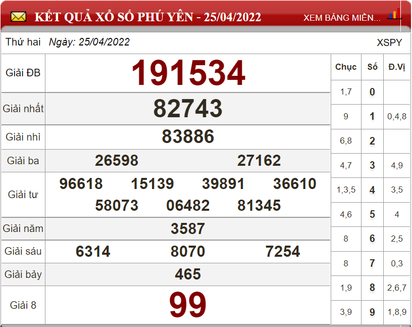 Kết quả lô đề theo xổ số Phú Yên ngày 25/4/2022