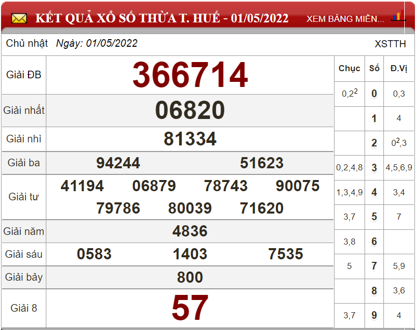 Kết quả lô đề theo xổ số Thừa T.Huế ngày 01/5/2022