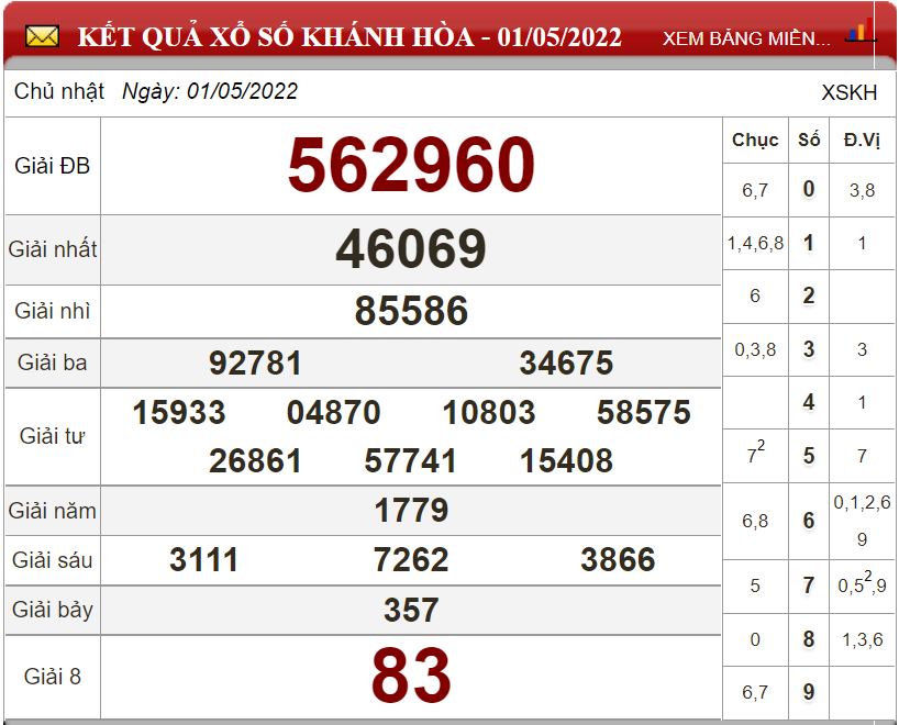Kết quả lô đề theo xổ số Khánh Hòa ngày 01/5/2022