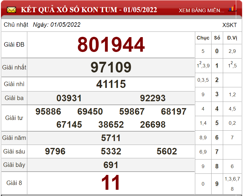 Kết quả lô đề theo xổ số Kon Tum ngày 01/5/2022