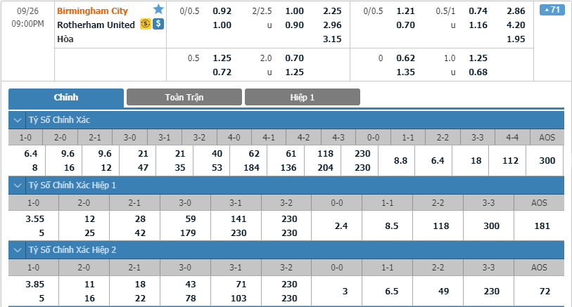 - Kèo tỉ số hiệp 1: Birmingham 0-0 Rotherham