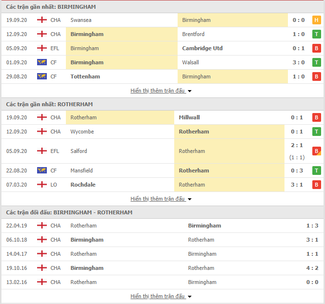 Phong độ gần đây & Thành tích đối đầu Birmingham vs Rotherham
