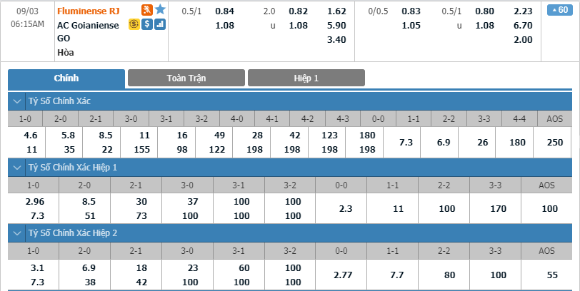 - Kèo tỉ số hiệp 1: Fluminense 1-0 Atletico Goianiense