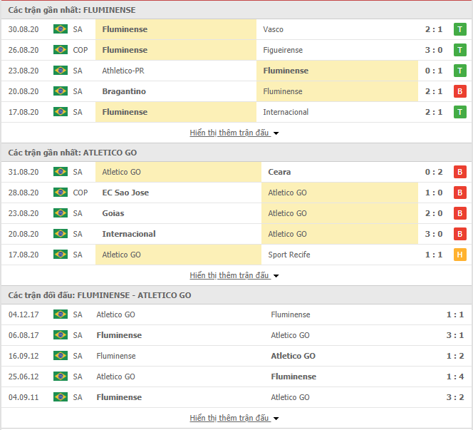 Phong độ gần đây & Thành tích đối đầu Fluminense vs Atletico Goianiense