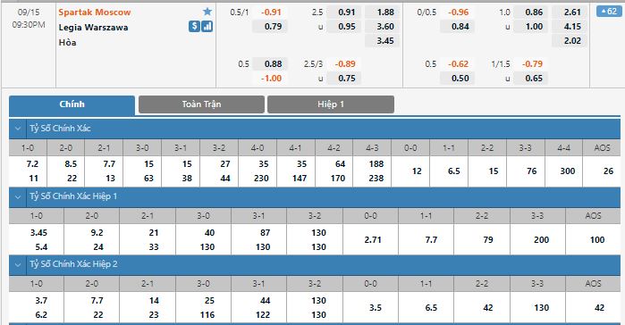Bảng tỷ lệ kèo trực tuyến trận đấu Spartak Moscow vs Legia Warszawa: