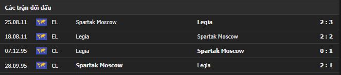 Thành tích đối đầu Spartak Moscow vs Legia Warszawa: