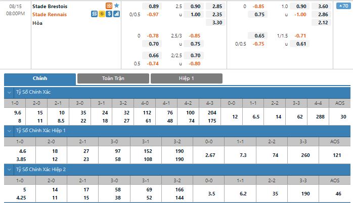 Bảng tỷ lệ kèo trực tuyến trận đấu Stade Brestois vs Rennes: