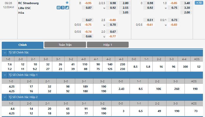 Bảng tỷ lệ kèo trực tuyến trận đấu Strasbourg vs Lille: