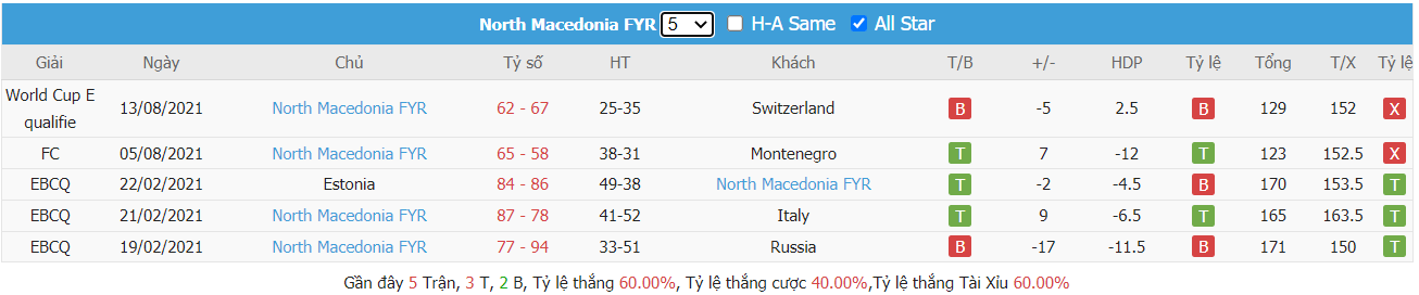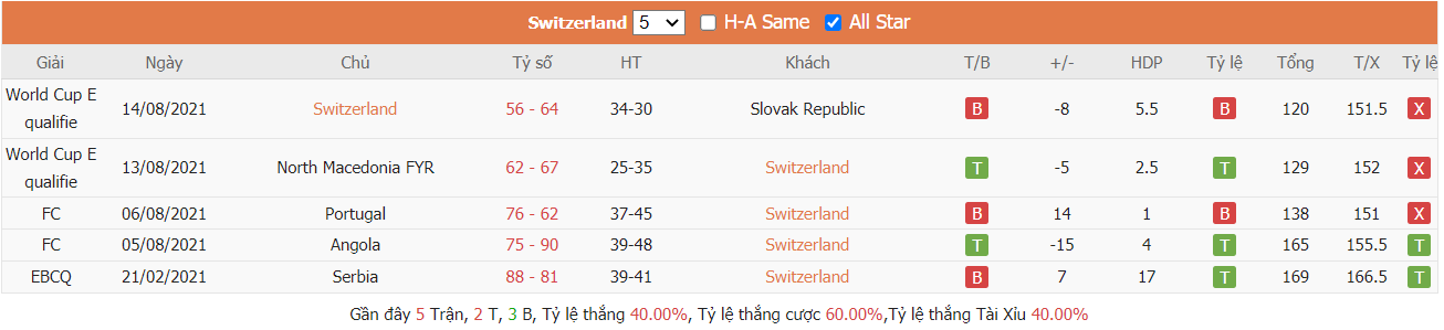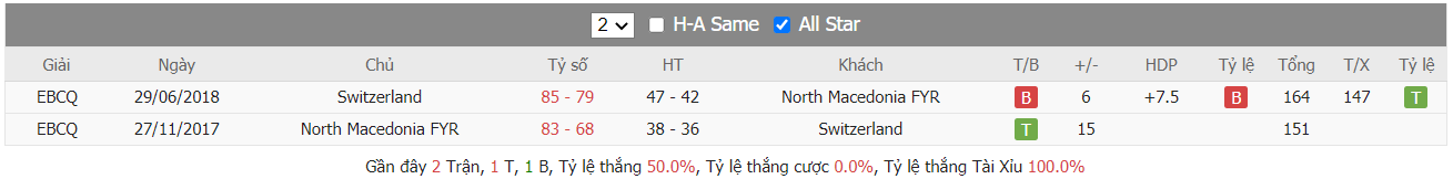 Thống kê cho thấy đây cứ trung bình mỗi trận sau tổng số 10 trận ra sân gần nhất North Macedonia cũng đều duy trì được sự phòng khoáng trong lối chơi khi mà trên hàng công đã ghi được trung bình tới 85 điểm mỗi trận và cũng đã để đối thủ bỏ vào rổ nhà trung bình tới 83 điểm mỗi. Từ đó dẫn tới 6 trên 10 trận đấu kể trên đều đã khép lại với các kết quả chung cuộc nổ tài. Vậy nên khả năng bùng nổ tỷ số ở trận tới cũng rất đáng được kỳ vọng khi mà cũng đã tới 7 trên 10 trận ra sân gần nhất của đội khách Switzerland cũng đều đã vượt qua mức kèo niêm yết theo TLCA. Đồng thời Switzerland cũng đã ghi được trung bình tới 87 điểm mỗi trận sau tổng số 10 trận ra sân gần nhất.