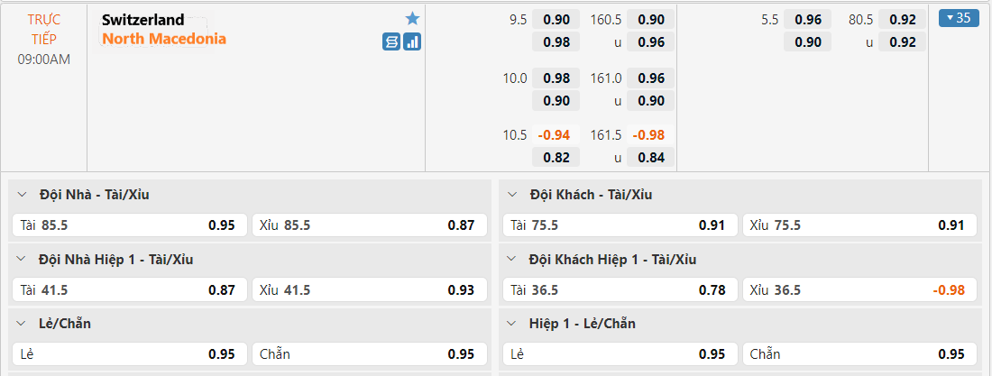 Bảng tỷ lệ kèo Switzerland vs North Macedonia