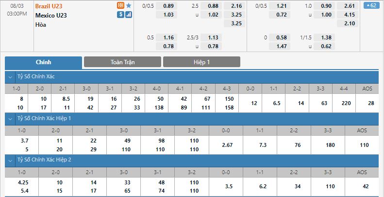 Bảng tỷ lệ kèo trực tuyến trận đấu U23 Brazil vs U23 Mexico